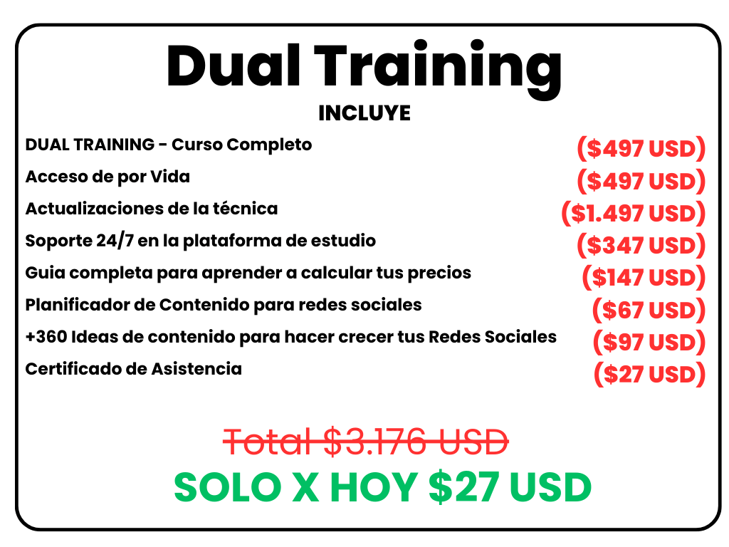 Con "Dual Training", no solo mejorarás la calidad de tus servicios, sino que también incrementarás tu cartera de clientes mes a mes.